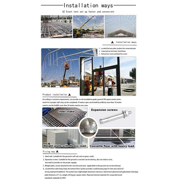 9. Installation : the tent is fixed by bolts and nuts . the tent can be fixed with ground through bases by different ways . On concrete floor , we use expansion screws to fix the bases with floor . On soft ground ( grass ground mud ground ) , we use big steel nails ( anchor ) to fix the bases with ground . On undistructible ground ( marble , asphalt ground etc ) , we use weight plate system to fix the bases with ground .